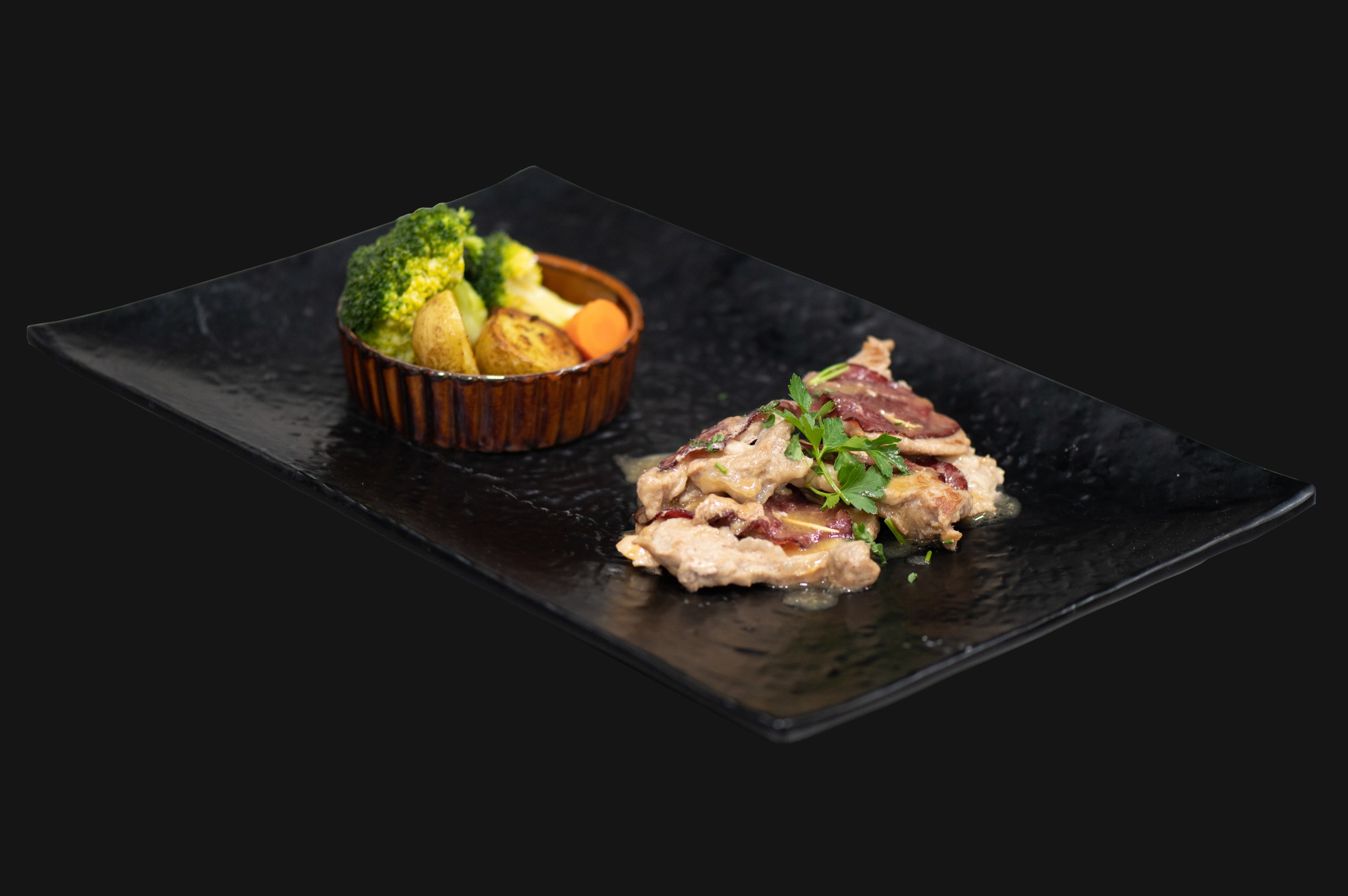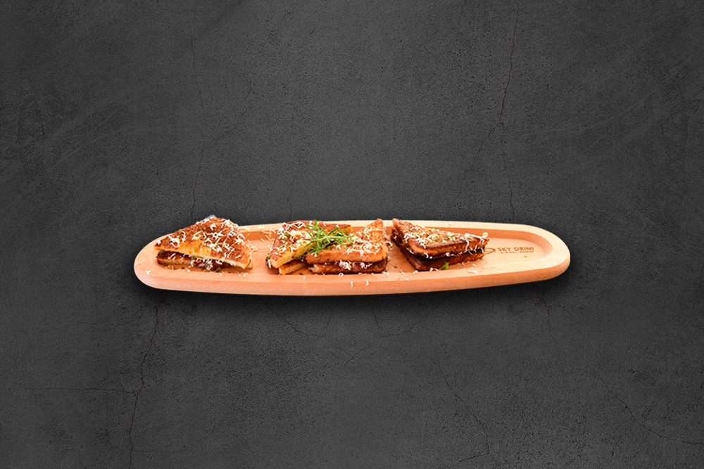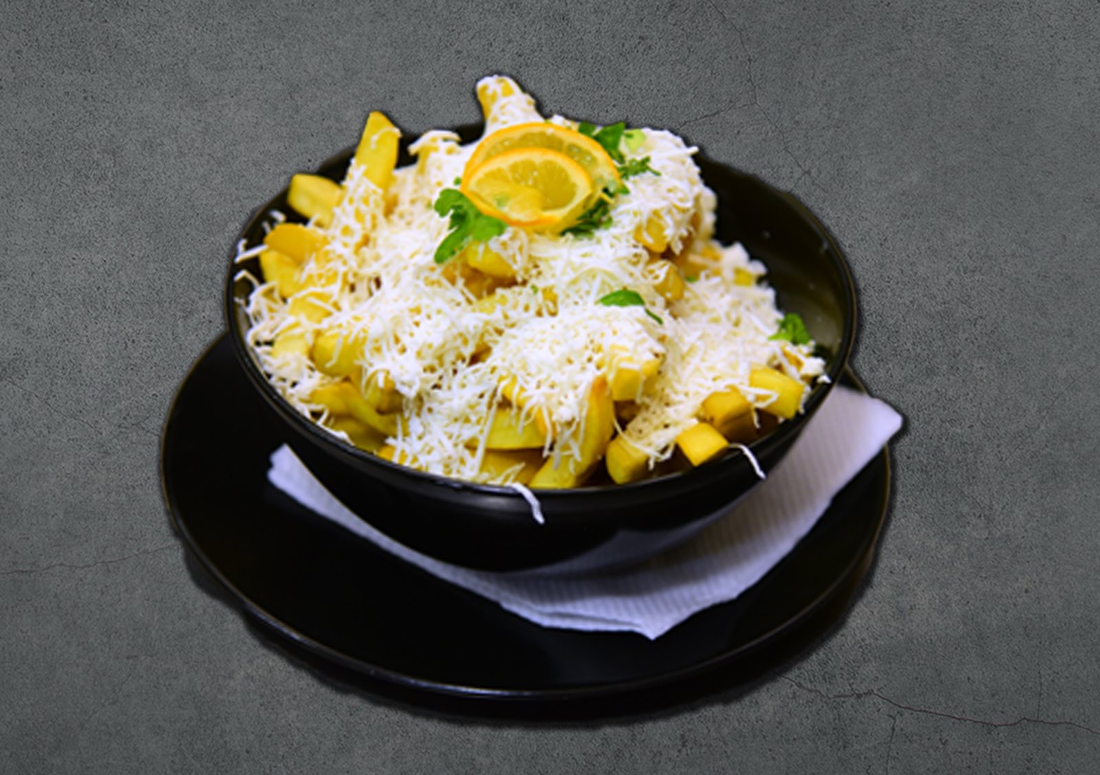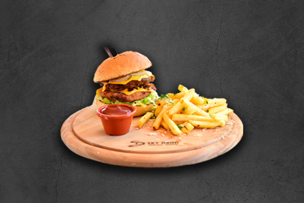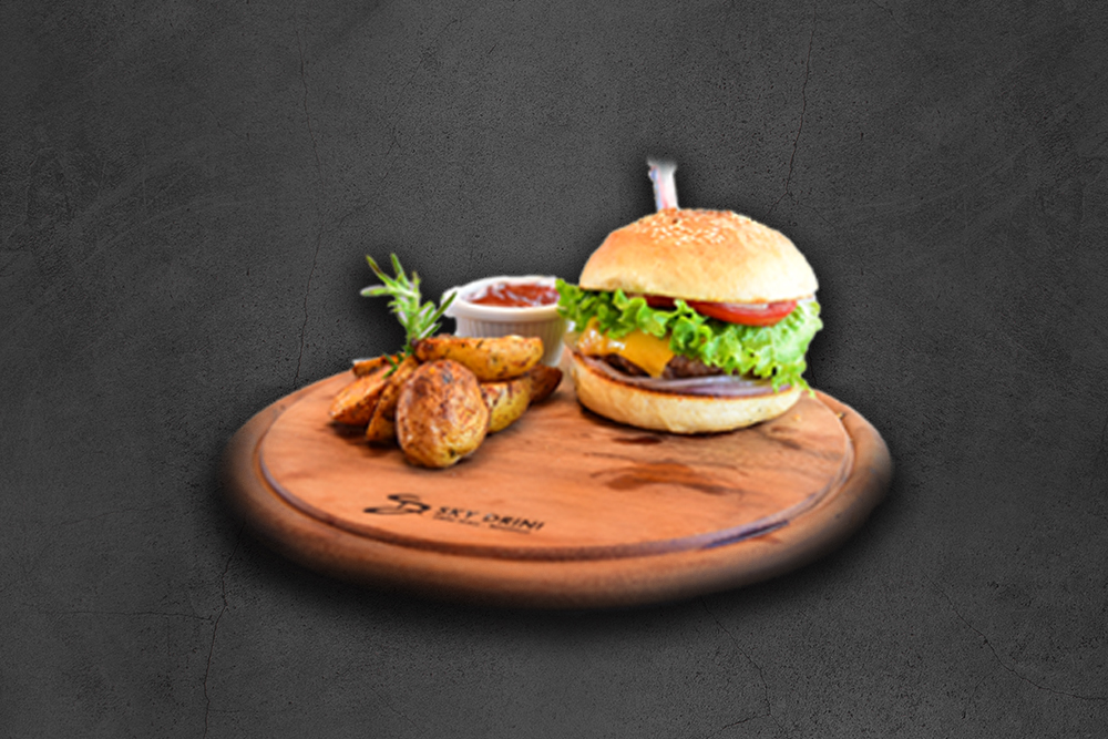 мелено месо, марула, чедап, домати, кромид сос, помфрит