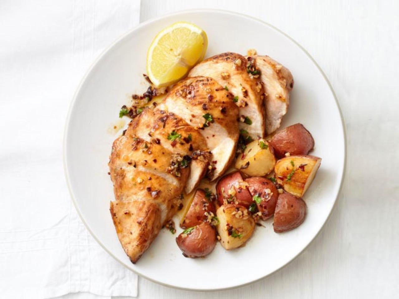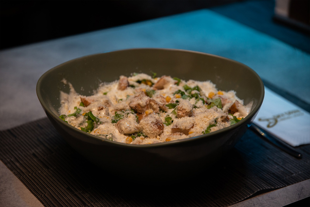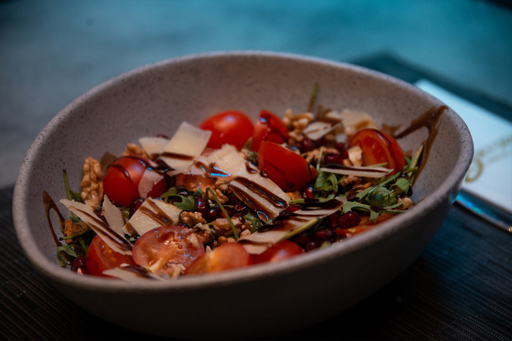 марула. пилешко, кубети, домати, краставици, пармезан, сос