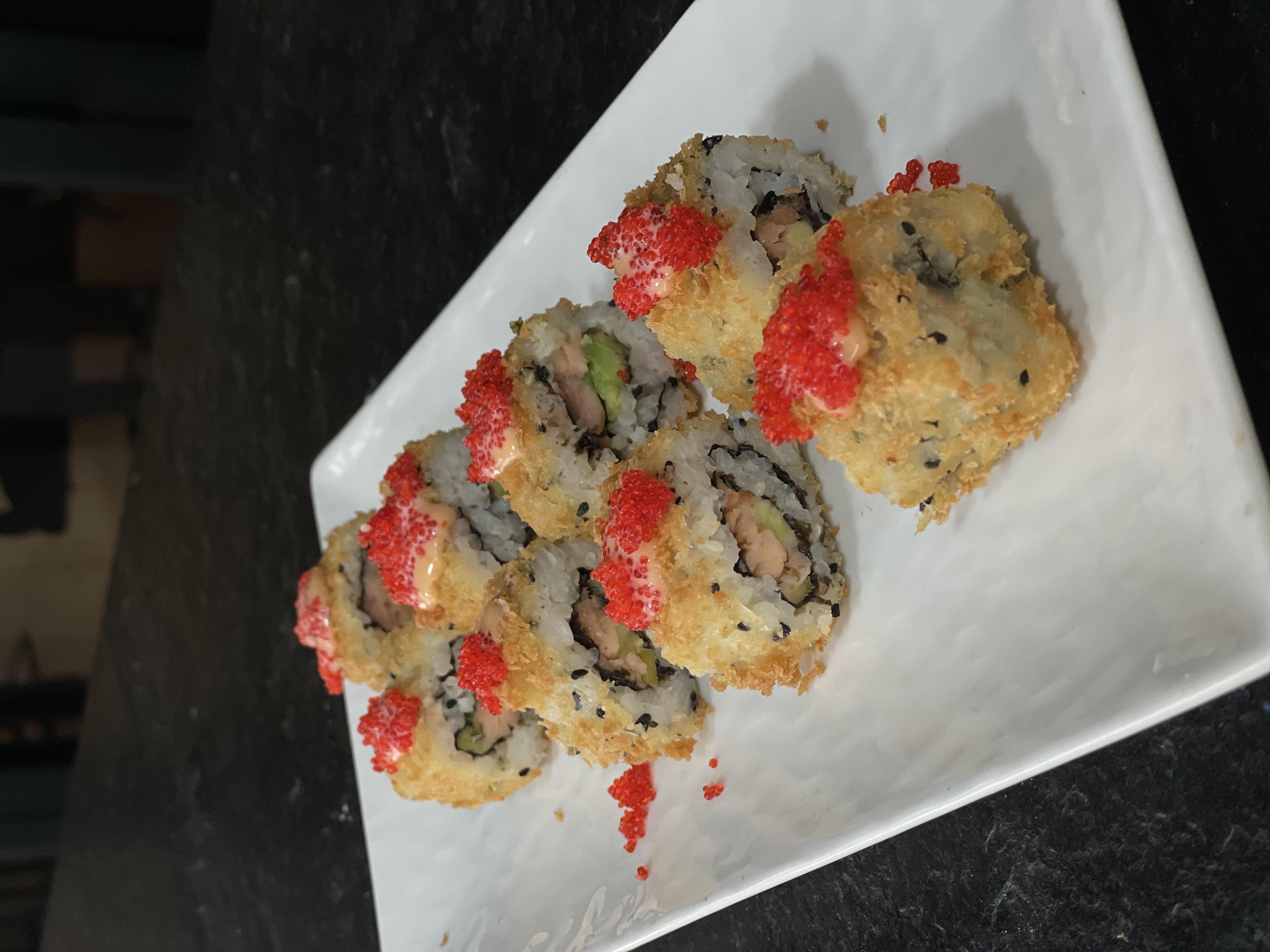 ориз, цели алга, лосос, авокадо, (пржени во темпура)